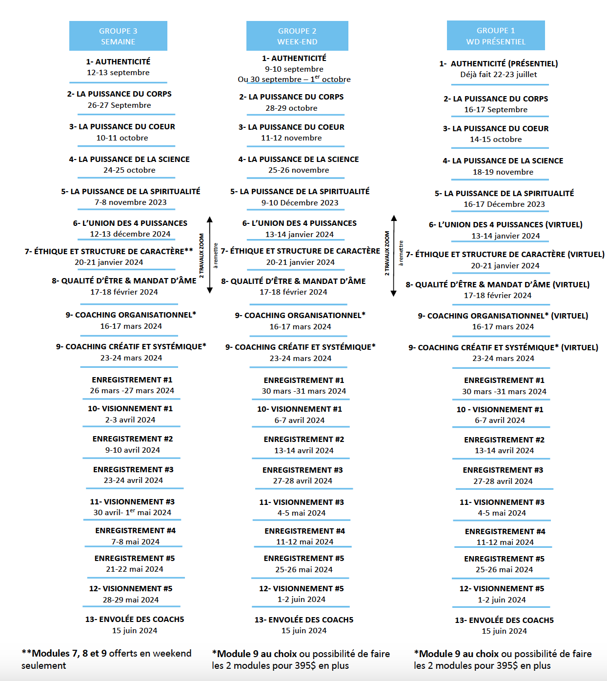 *Un grand nombre de nos étudiants suivent ce parcours propulsant pour eux-mêmes, sans vouloir en faire leur métier. Nous leur ouvrons donc les portes de ce programme qui s’avère tout aussi puissant pour transformer ses relations professionnelles, personnelles, amicales, familiales, etc...
